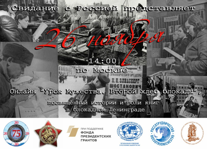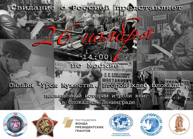 В рамках Международного медиа проекта "Свидание с Россией" по инициативе Центра исторического добровольчества «Паруса истории» совместно с Некоммерческим партнёрством "КиТ" при поддержке Россотрудничества и Бессмертного полка России 26 ноября в 14.00 по московскому времени состоится онлайн-урок мужества «Второй хлеб блокады».