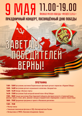 9 мая в честь Дня Победы Бессмертный полк России с 11:00 проводит в Парке Победы – в филиале Музея Победы «Музей Г.О.Р.А.» - концерт «Заветам Победителей верны!».