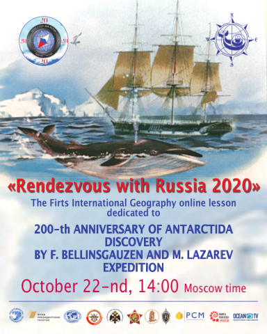 22 октября в 14.00 по московскому времени в рамках Международного медиапроекта «Свидание с Россией» при поддержке Фонда президентских грантов, Россотрудничества, Русского географического общества, ДОССАФ, Бессмертного полка России, Российского союза ветеранов, Океан ТВ состоится первый Международный онлайн Урок географии, посвящённый 200-летию открытия Антарктиды экспедицией Фаддеея Беллинсгаузена и Михаила Лазарева.