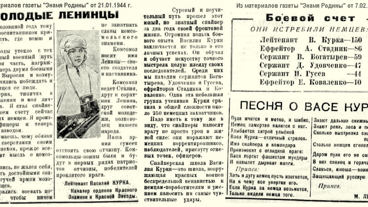 В октябре 1943 года грудь Василия Курка украсил орден Красной Звезды. «Пуля мчится и метко, и шибко. Немец замертво валится с ног. Улыбается хитрой улыбкой Вася Курка – отличный стрелок. Имя снайпера и командира произносят с оглядкой враги. Вася портит фашистам мундиры и навылет дырявит мозги. Знают дальние снежные горы, знают реки, леса и поля: сколько выстрелил снайпер патронов – столько немцев сгноила земля. Даром пули его не свистали, в них свинец и горячая месть. Славься, юноша – воин бывалый, защищающий русскую честь!» - в армейской дивизионной газете «Знамя Родины» в своей «Песне о Васе Курке» писал поэт Лужнев.