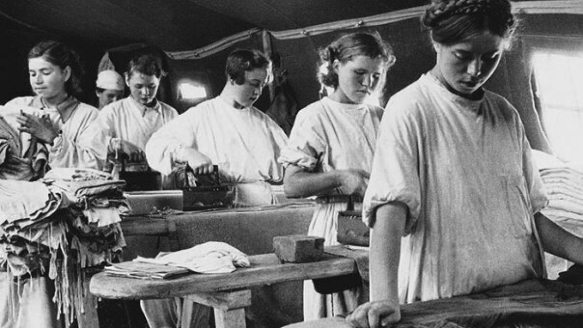 За смену прачки вручную стирали до трех сотен пар белья. Конечно, никаких автоматических машин тогда не было. Были ручные, требовавшие крутить ручку, чтобы проворачивать барабан с заложенным туда бельём. За один сеанс стирки можно было выстирать до двадцати пар белья, при этом требовалось самому крутить барабан. Затем вытащить бельё, вручную выжать, повесить сушиться. Затем снова кипяток и снова бельё. Когда не работали и такие машинки, бельё стиралось вручную.