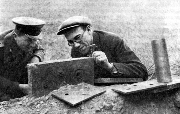 На фото: 1944 г. М.А. Лаврентьев исследует пробивание танковой брони кумулятивным снарядом