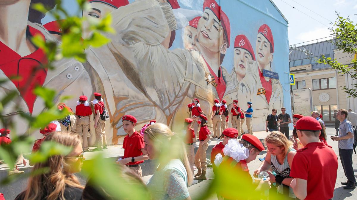 По другую сторону граффити нарисованы юнармейцы - все они почти ровесники юного Вани из "Офицеров". Каждый юнармеец - участник юбилейного Парада Победы на Красной площади в 2020 году.