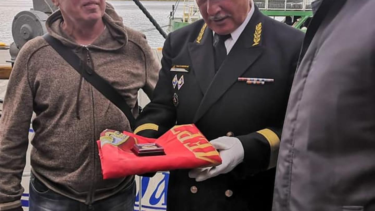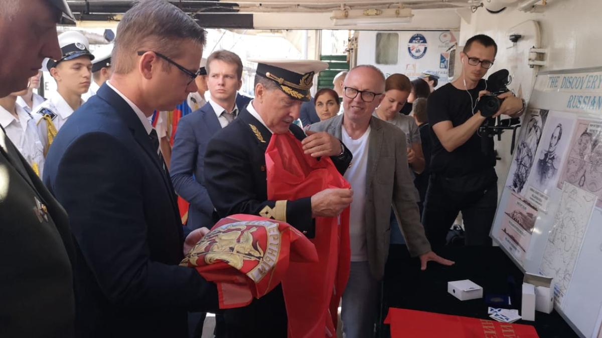 На церемонии торжественного прибытия на борт «Паллады» Генерального консула РФ в Кейптауне (ЮАР) Евгения Косенкова капитан «Паллады» Николай Зорченко и руководитель Международного медиапроекта НП «КиТ» «Свидание с Россией 2020» Александр Ильин торжественно вручили копию знамен представителям русской Дипломатической миссии.