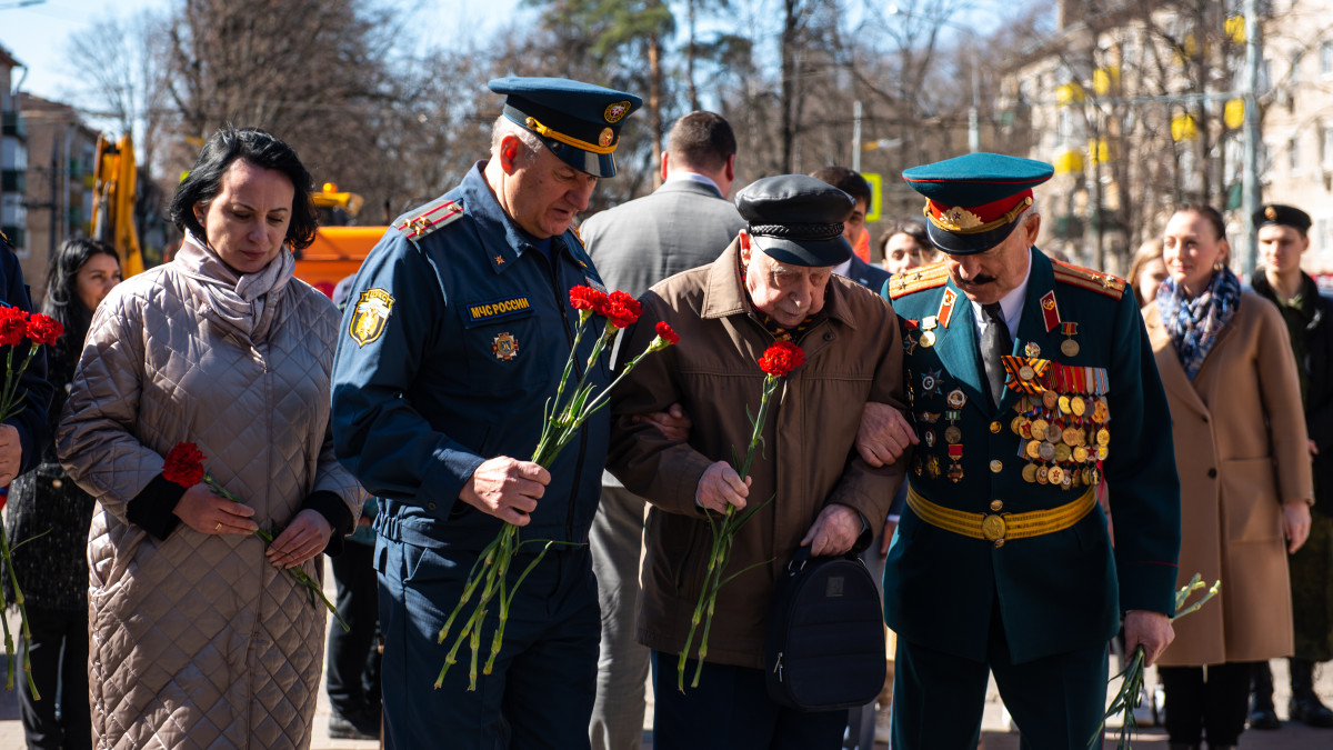 Мероприятие началось у Вечного огня с торжественного построения кадетов, возложения цветов и выступления ветерана Великой Отечественной войны Ивана Никитовича Кривошеева, которому недавно исполнился 101 год. Он участвовал в Сталинградской битве, освобождал Донбасс, Украину и Польшу, в том числе узников концлагеря Освенцим. В копилке ветерана много медалей, среди них - нагрудный знак «Освободителю Донбасса».