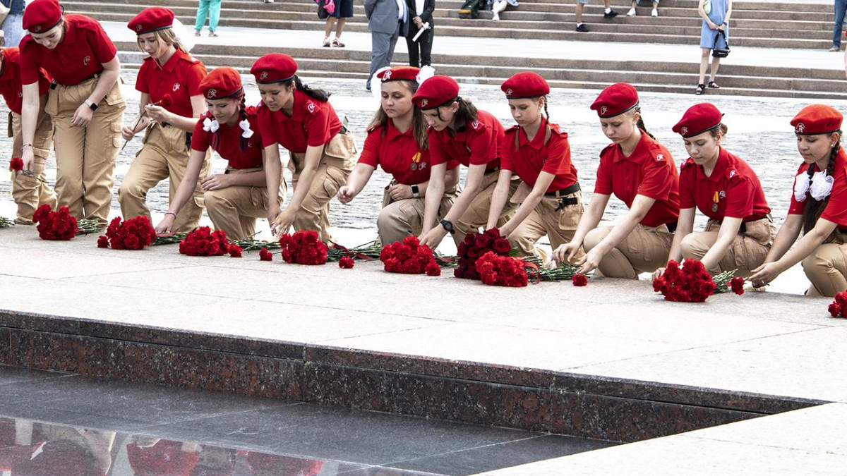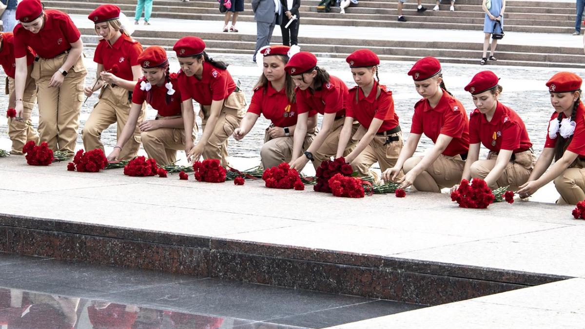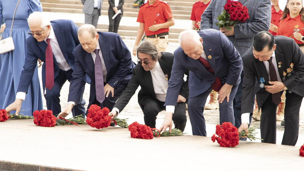 Затем участники церемонии поклонились памяти павших защитников Отечества, возложив цветы к Вечному огню у мемориального комплекса на Площади Победителей.