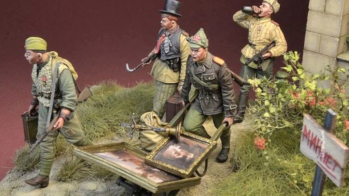 Один везет украденные картины, второй на ходу пьет горькую. Третий уносит старинный хронометр, и на запястье у него несколько наручных часов. Четвертый – в жилетке поверх военной формы, с тростью под мышкой, в цилиндре и с галстуками на шее. Уродливые карикатуры на солдат и офицеров Красной Армии в виде фигурок из новой серии частной компании в городе Познань, которая специализируется на изготовлении коллекционных солдатиков. Автор – польский художник Павел Красицкий.