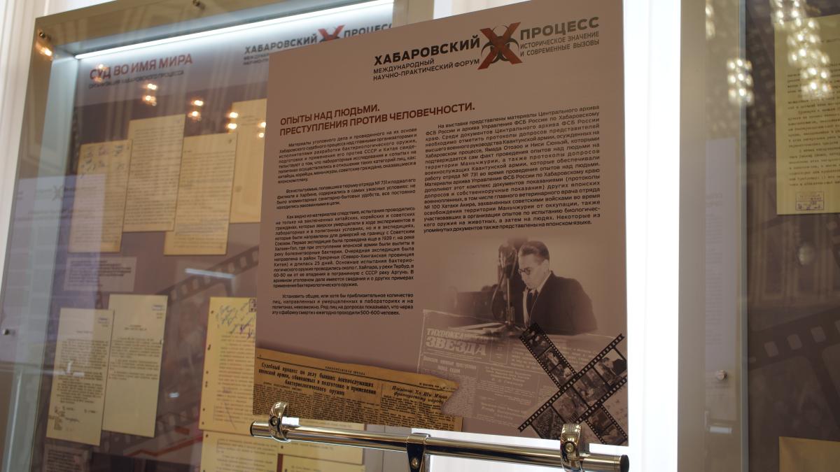 На Международном научно-практическом форуме, посвященном историческому значению Хабаровского процесса 1949 года над японскими военными преступниками, в Хабаровске открылась уникальная выставка документов, свидетельствующая об истинной цели проведения Хабаровского процесса – привлечении внимания мировой общественности к угрозе бактериологической войны и ее предотвращение.