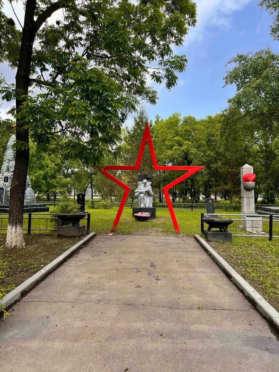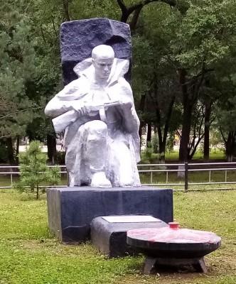 В поселке Пограничный в Приморском крае солдат преклонил колено перед павшими боевыми товарищами. Это памятник воинам-артиллеристам 217-й корпусной бригады, павшим в августе 1945 года при штурме японских укреплений. Памятник находится в парке имени Валентина Котельникова – уроженца Донбасса, погибшего при отражении бандитского рейда самураев на погранзаставу в далеком 1935 году.
