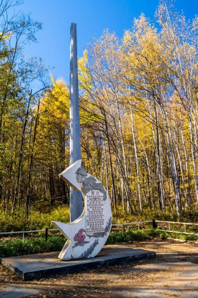 Этот памятник стоит ровно на 50-й параллели земного шара, в 6 километрах от сахалинского поселка Рощино. В 1945 году здесь проходила советско-японская граница. Отсюда 11 августа началось освобождение южной части острова от японцев. Монумент представляет собой 8-метровый трёхгранный штык и широко изогнутую стрелу, показывающую строго на юг — в направлении главного удара.