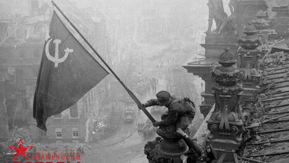 На фото: на снимке, сделанном 2 мая 1945 года на рейхстаге сержанта Ковалева со ззнаменем поддерживает старший сержант Исмаилов..