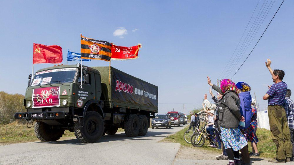 «Бессмертный автополк» проехал по деревням и селам Тобольского района Тюменской области. Ветеранов и тружеников тыла поздравили артисты районного центра культуры.