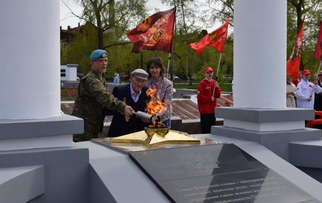 Частица пламени от Могилы Неизвестного Солдата преодолела более двух тысяч километров и зажгла Вечный огонь в сквере Воинской славы города Шадринска Курганской области.