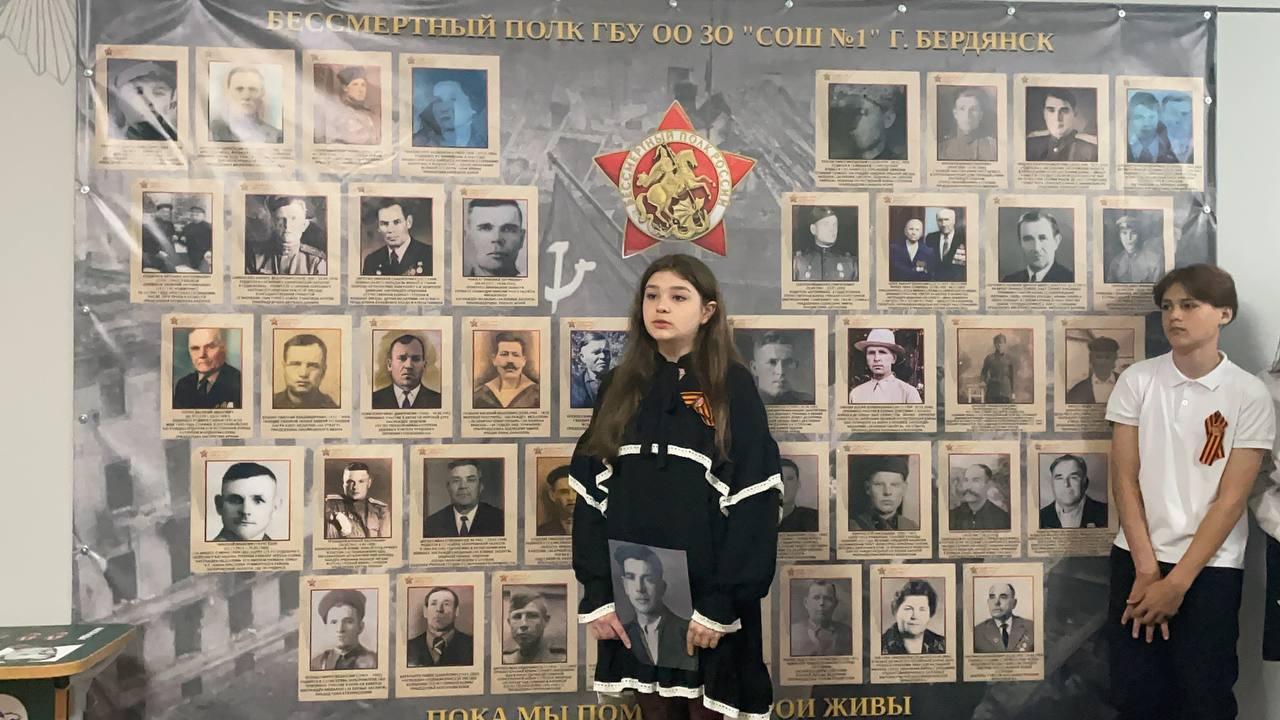 В средней школе №1 города Бердянска при участии руководителя регионального отделения Бессмертного полка России в Запорожской области Романа Старикова состоялось торжественное открытие тематического пространства, представленного баннером «Бессмертный полк» и «Партой Героя». Баннер «Бессмертный полк» вместил 42 фотографии родственников учителей и учащихся школы. «Парта Героя» посвящена выпускнику школы, боевому летчику, который героически себя проявил в годы Великой Отечественной войны В.К.Ревуцкому.