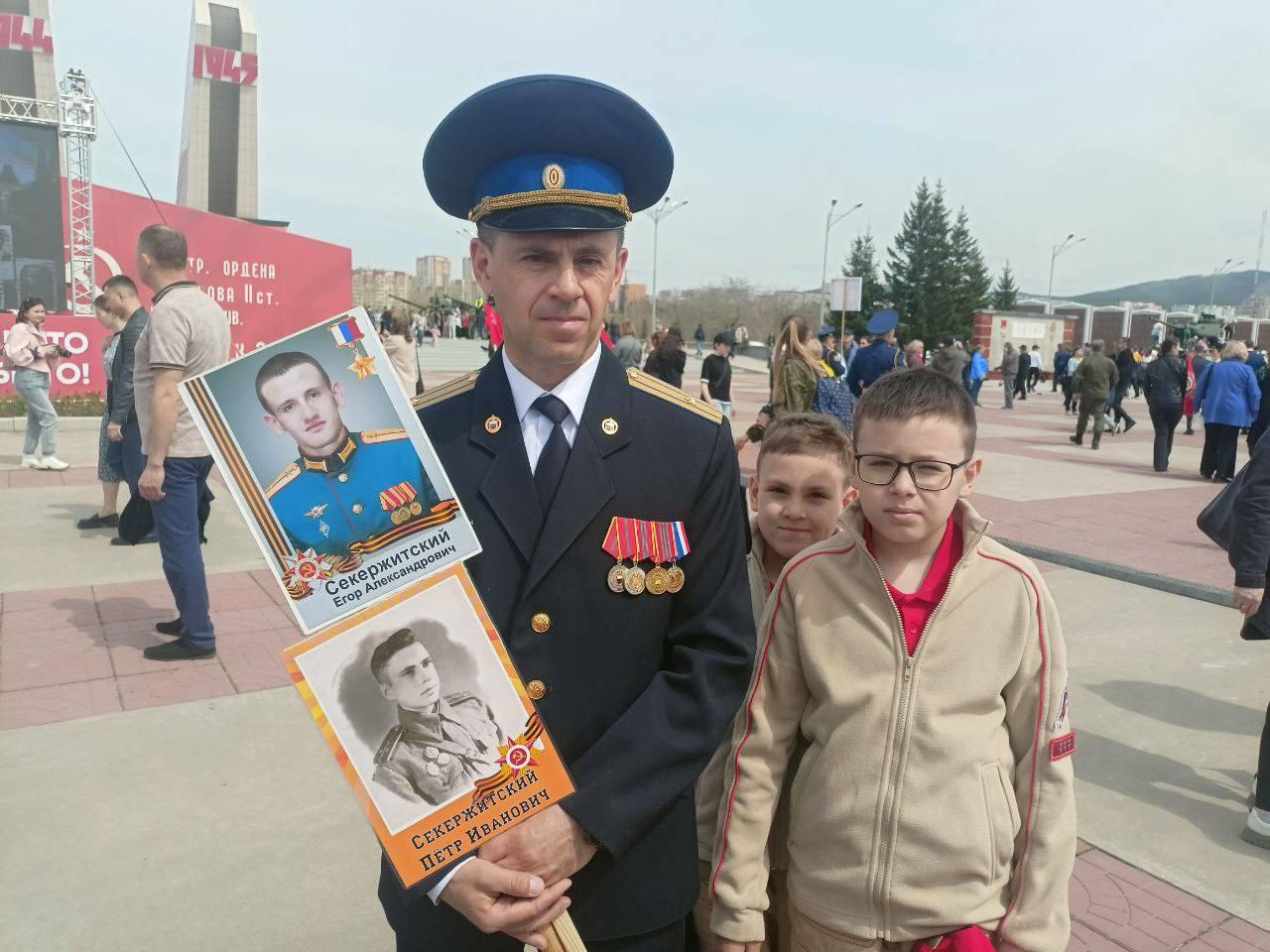 Практически весь городской служебный и общественный транспорт был украшен портретами участников Великой Отечественной войны и специальной военной операции – спасибо коммунальным службам и сотрудникам ГИБДД, которые ответственно подготовились к акции Бессмертного полка.