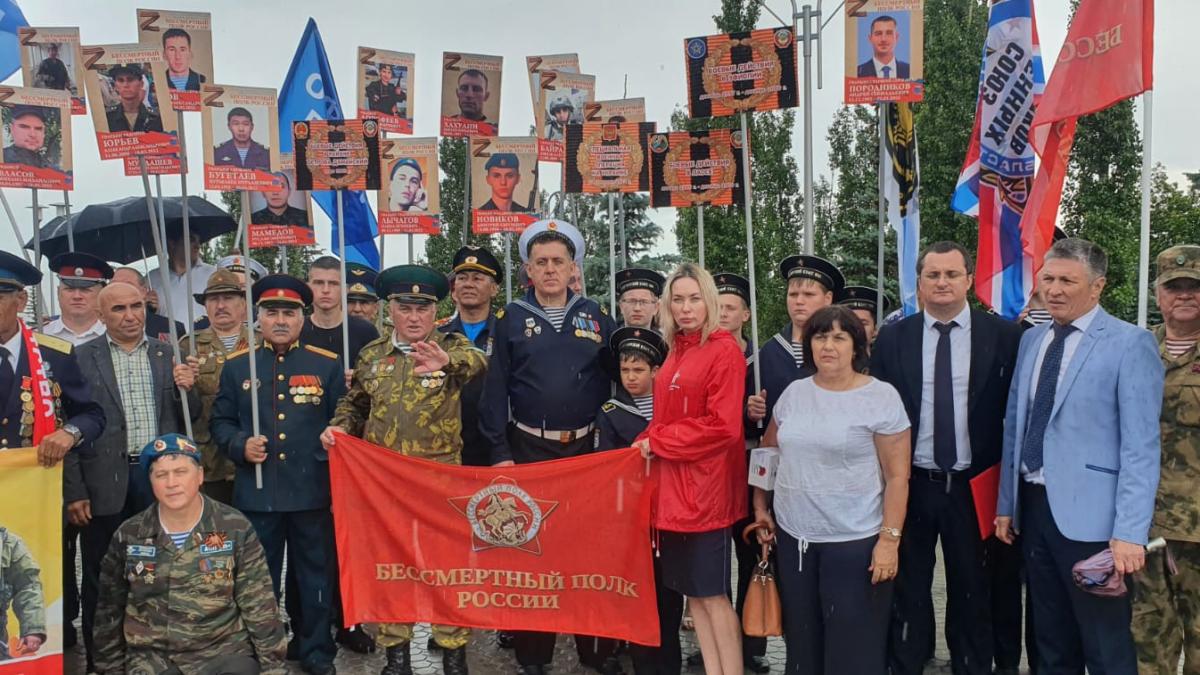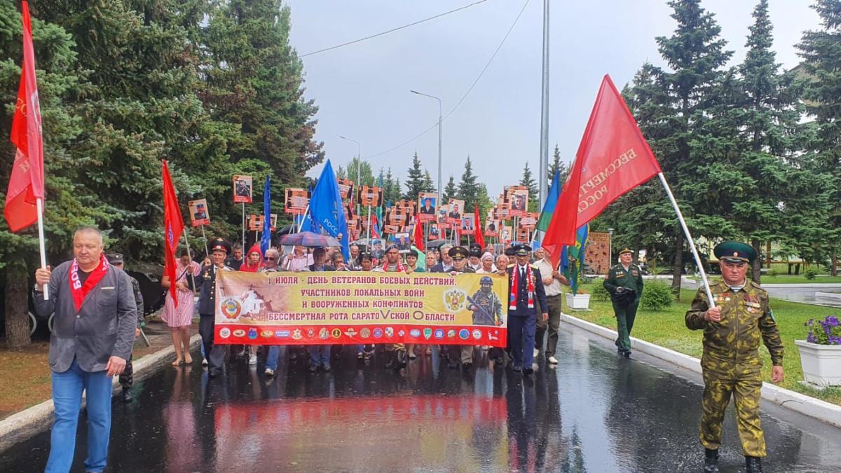 Региональные отделения Бессмертного полка России и Боевого Братства в Саратовской области прошли в едином строю Бессмертной роты Саратовской области со штандартами локальных войн и военных конфликтов и портретами погибших в специальной военной операции от мемориала Землякам, погибшим в локальных войнах к Вечному огню.