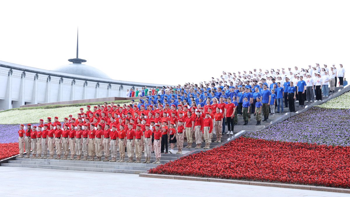 У флагштока в виде российского триколора построились представители общественных организаций, волонтёры, поисковики, юнармейцы и многие другие. Бессмертный полк России в «живом» флаге вошел в ряды белого цвета. На торжественную церемонию поднятия флага собрались Герои труда России и лауреаты Государственных премий, сегодня получившие свои награды в Кремле.