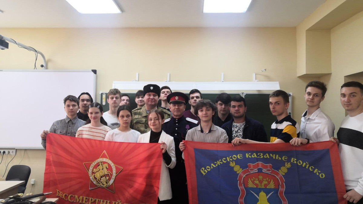 В рамках Урока мужества участники специальной военной операции - руководитель исполкома регионального отделения Бессмертного полка России в Саратовской области Андрей Бердников и заместитель атамана Саратовской области Волжского войскового казачьего общества, командир Пластунской сотни Сергей Фролов – поделились фронтовыми историями о героизме сослуживцев и ответили на вопросы школьников.