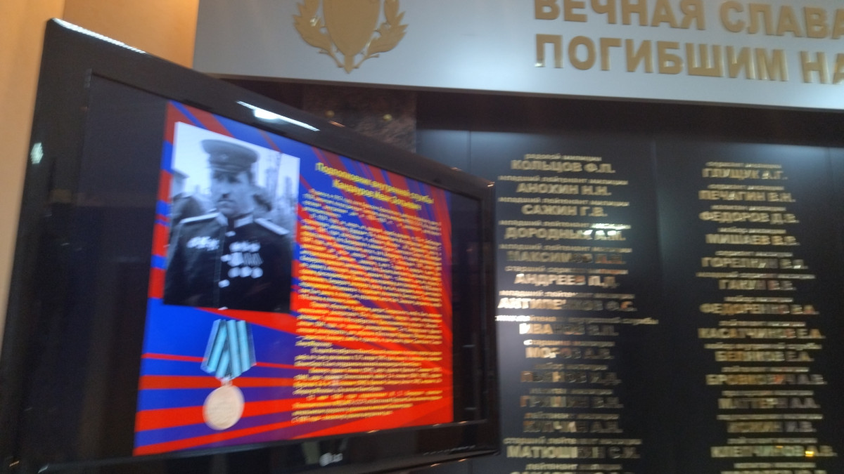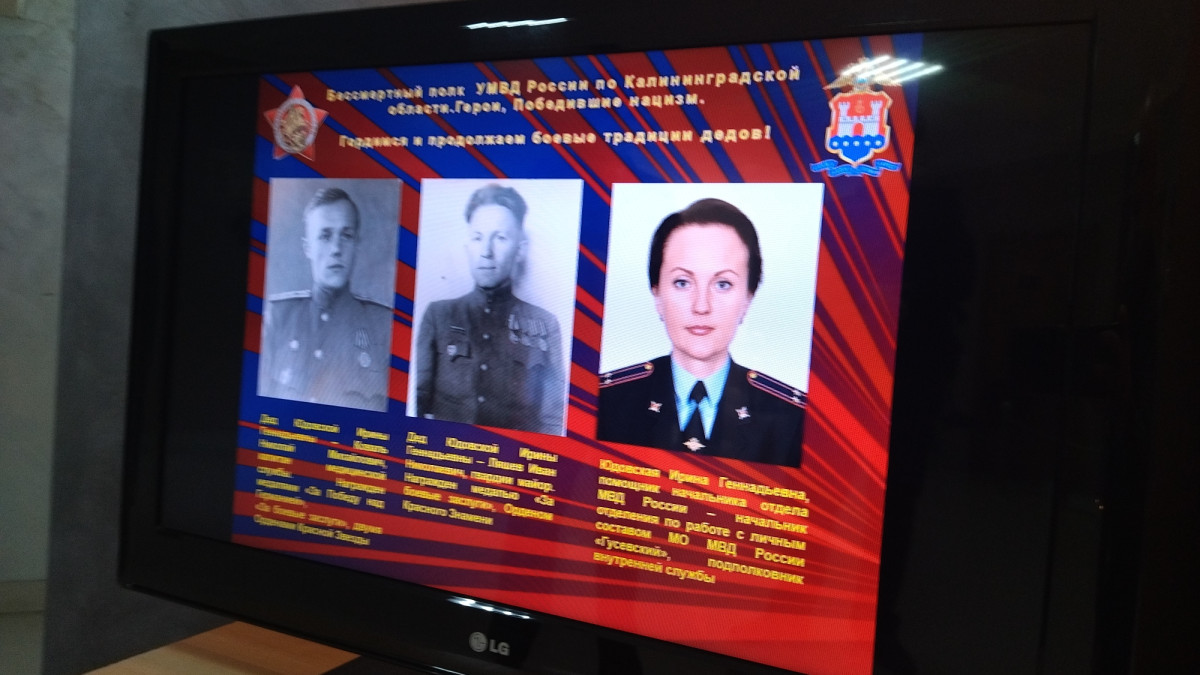 Презентация созданная командиром «Бессмертного полка УМВД России по Калининградской области», историком УМВД полковником полиции в отставке А.М. Щегловым, непрерывно транслируется на информационном экране в здании УМВД, а также разослана во все структурные подразделения, сотрудникам органов внутренних дел.