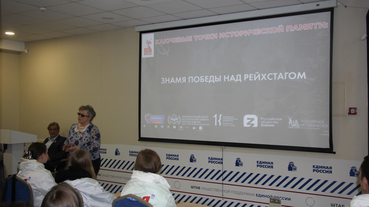 80-летию водружения над Рейхстагом Знамени Победы члены штаба ООД «Бессмертный полк России» в Кемеровской области совместно с региональным отделением общества «Знание» посвятили исторический час «Подвиг, ставший символом», пригласив к разговору активистов молодежных организаций региона: «Движения Первых», Союза Молодежи Кузбасса, Молодой Гвардии Единой России, с которыми тесно сотрудничает региональное отделение полка. Участниками мероприятия стали и участники СВО, члены организации «Боевого братства».