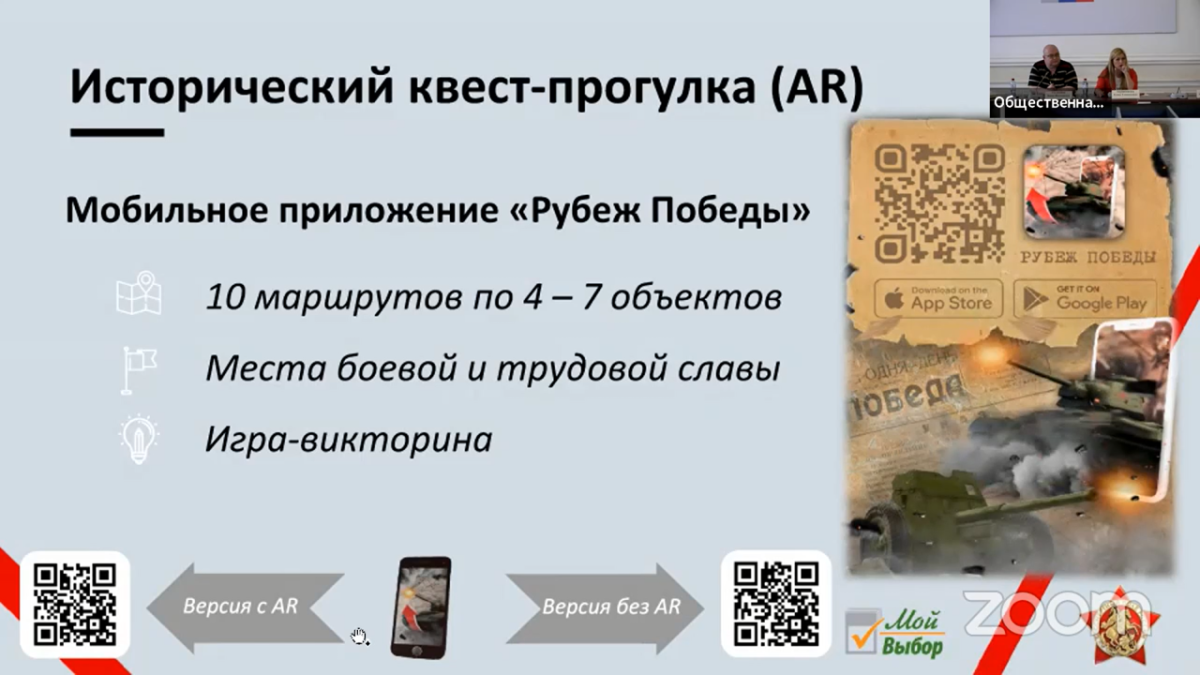 Он рассказал участникам о проектах с использованием технологий виртуальной и дополненной реальности. В частности, о мобильном приложении с дополненной реальностью и квестовыми историческими маршрутами «Рубеж Победы» по местам боевых и трудовых достижений жителей Подмосковья в период Великой Отечественной войны. Приложение позволяет узнать важную информацию, пройти исторические маршруты, изучить исторические объекты в городах области и ответить на вопросы викторины, а также рассмотреть некоторое вооружение в дополненной реальности, сразиться с противником в игре и получить диплом за победу. «Рубеж Победы» активно используют педагоги при дополнительных занятиях с детьми школах и вожатые в детских летних лагерях.