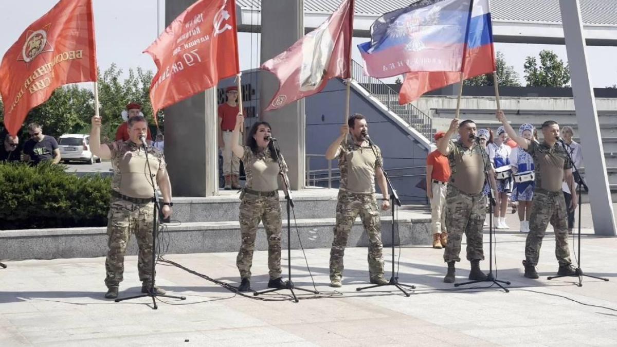 Поздравления в День России звучат сегодня по всей стране. Перед жителями Мариуполя выступили артисты фронтовой агитбригады. Член регионального штаба Бессмертного полка России в Московской области, победитель нескольких творческих конкурсов Движения Олег Непряхин в этой бригаде уже год. День России встретили в самом центре Луганской Народной Республики.