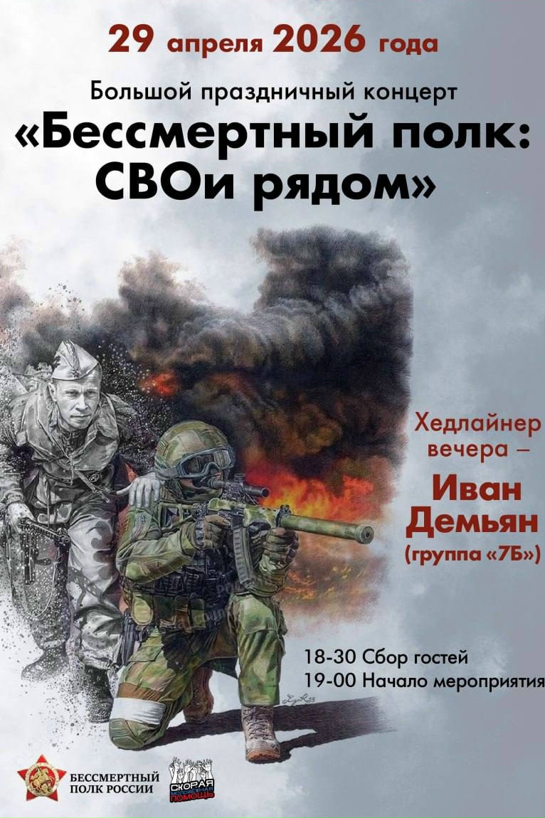 29 апреля в «Мастерской Победы» им. Героя России А.А. Аксенова г. Москвы состоится праздничный концерт «Бессмертный полк: СВОи родные», посвященный Дню Победы. Мероприятие организуют региональное отделение Бессмертного полка Росси в Москве со столичной организацией «Скорая Молодёжная Помощь».