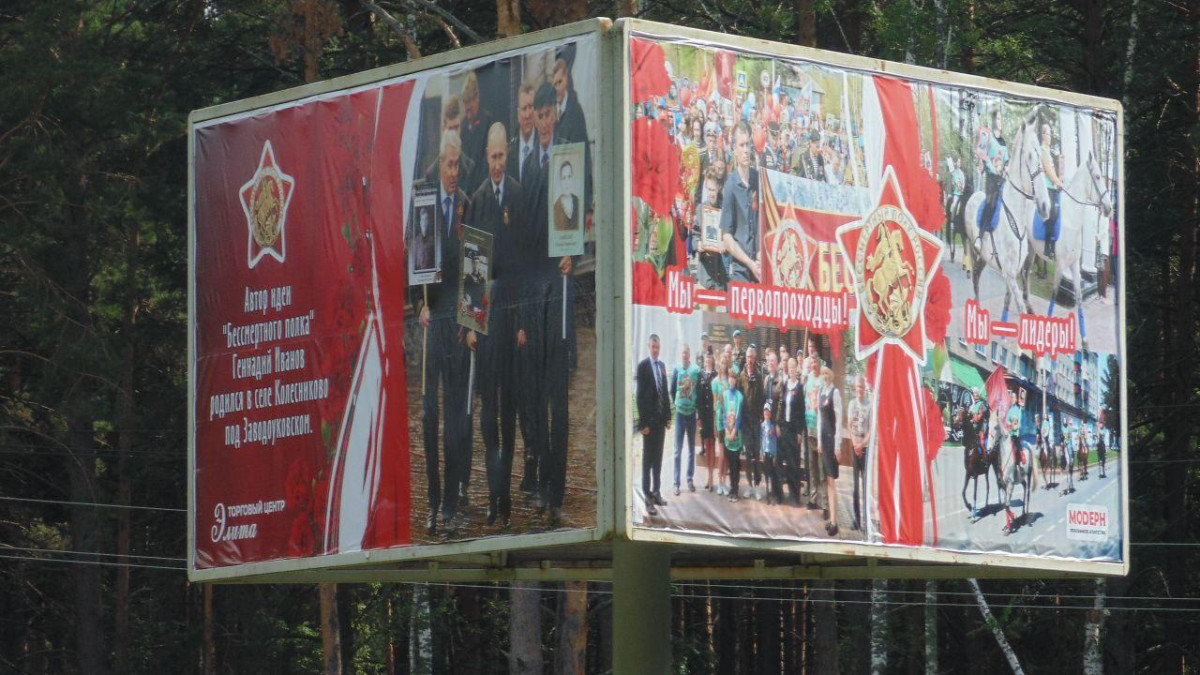 В этом году движение «Бессмертный полк России» отмечает своё 10-летие. Первый юбилей организаторов самой масштабной акции в День Победы. К этому событию на родине акции "Бессмертный полк" в Тюменской области установили три щита, посвящённых истории Движения. Эти щиты размещены на объездной дороге города Заводоуковска.