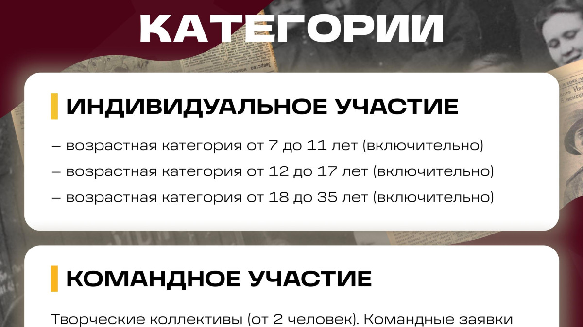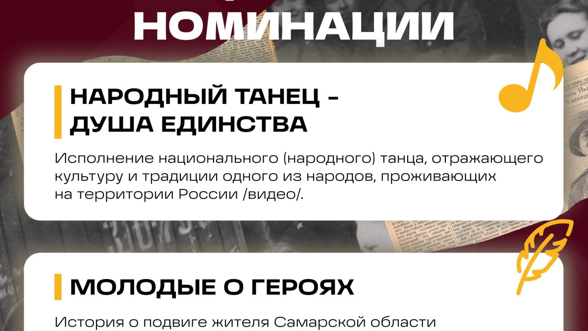 В Самарской области вновь стартовал конкурс творческих работ «На Zащите мира». Ежегодно региональное отделение Бессмертного полка России вместе с Самарским Союзом Молодежи проводит конкурс, который выявляет талантливых и артистичных жителей Самарской области. В этом году возможность показать всему региону свои способности у самарцев есть в четырех различных номинациях, о которых рассказали на карточках.