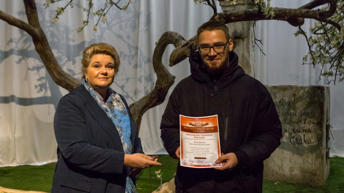 Церемония награждения прошла в трехмерной панораме «Память говорит. Дорога через войну». По просьбе штаба регионального отделения Движения благодарственные письма активистам вручила представитель дирекции Года памяти и славы Елена Петровна Малышева.