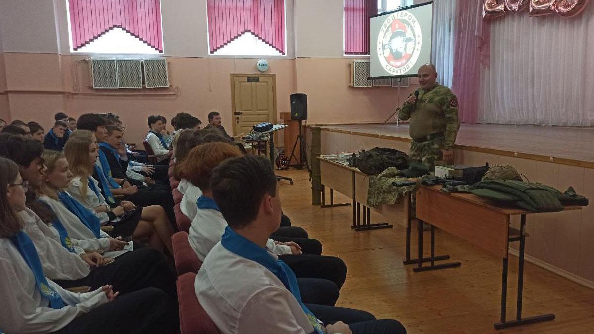 Сегодня в рамках военно-патриотического воспитания для школьников урок мужества провели руководитель исполкома регионального отделения Бессмертного полка России в Саратовской области, ветеран боевых действий и участник СВО Андрей Бердников вместе с волонтером общественной организации «Твои герои, Саратов» Дмитрием Молоковым.