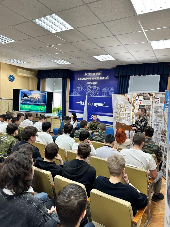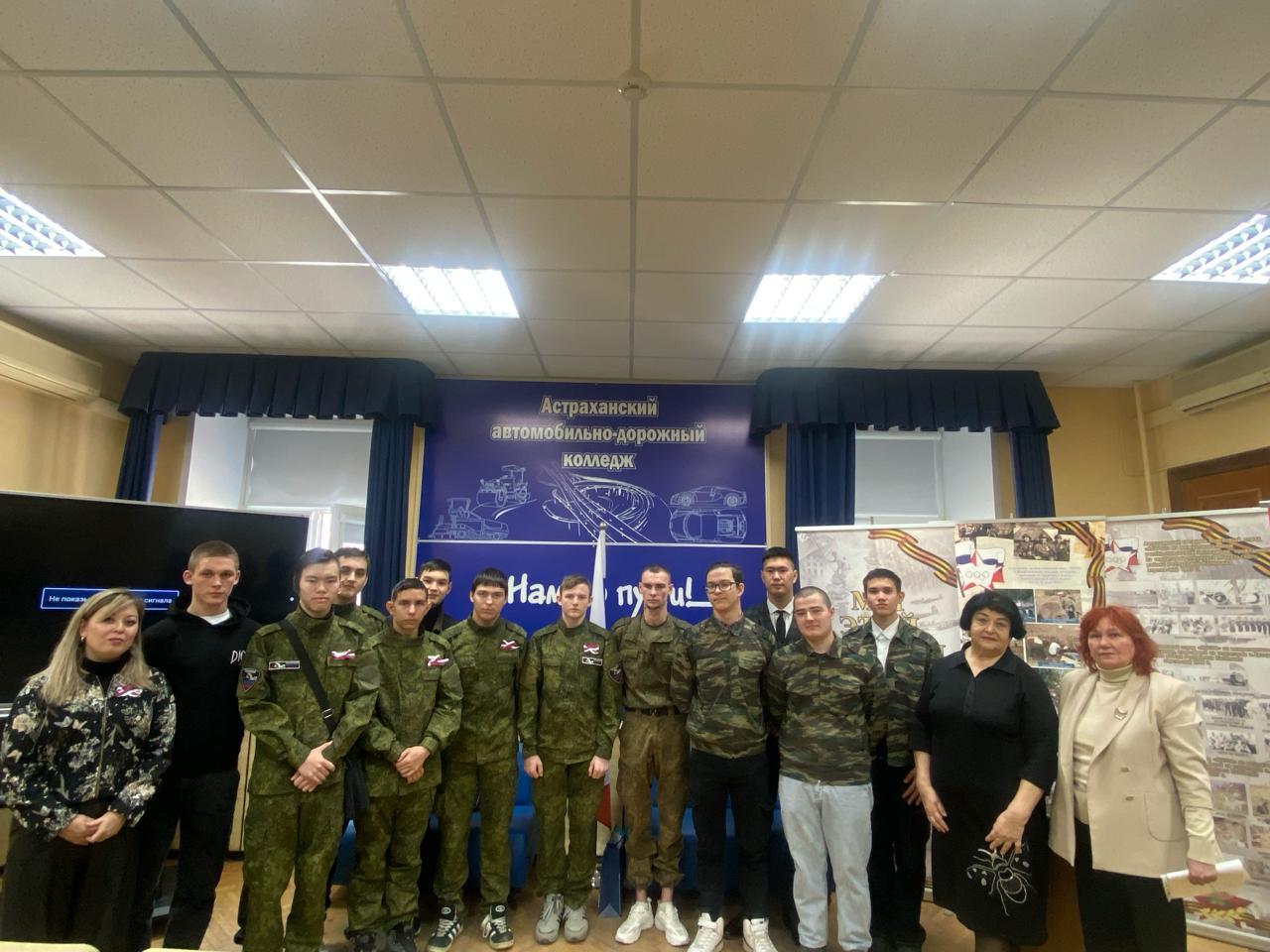 Активисты регионального отделения Бессмертного полка России в Астраханской области и поискового отряда «Память» Астраханского автомобильно-дорожного колледжа организовали и провели для студентов первого курса Урок Мужества «Отчизны верные сыны». В мероприятии принял участие Виталий К. - участник специальной военной операции.