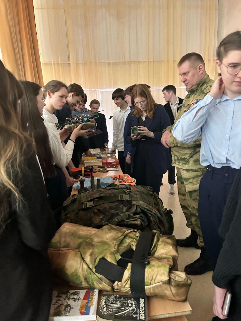 Андрей Владимирович провел небольшую экскурсию по экспонатам, представленным на мероприятии. Школьники ознакомились с предметами, примерили форму, рассмотрели книги. Все экспонаты были привезены из зоны СВО, несколько из них передали в музей лицея.
