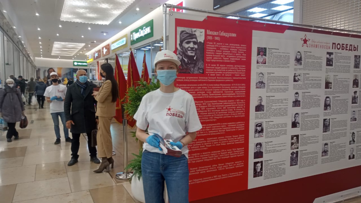 На стенде работают волонтеры, которые раздают буклеты с именами героев. Размещенные там же QR-коды дают своими руками установить Знамя Победы над Рейхстагом.