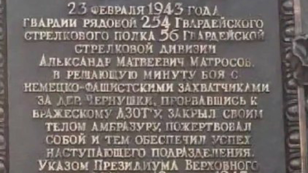 Летом 1943 года Александру Матросову посмертно вручили звание Героя Советского Союза за то, что 27 февраля того же года он, стрелок-автоматчик 2-го батальона 91-ой отдельной Сибирской добровольческой бригады, у деревни Чернушки Локнянского района Калининской области закрыл своей грудью амбразуру немецкого дзота – ценой собственной жизни спасая однополчан. В комсомольском билете его потом появится запись: «Лег на боевую точку противника и заглушил её. Проявил геройство».