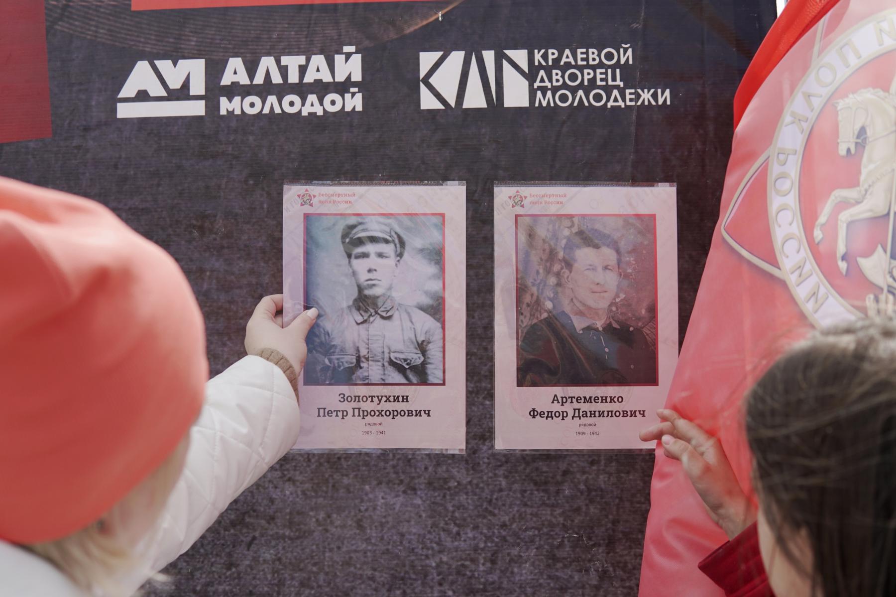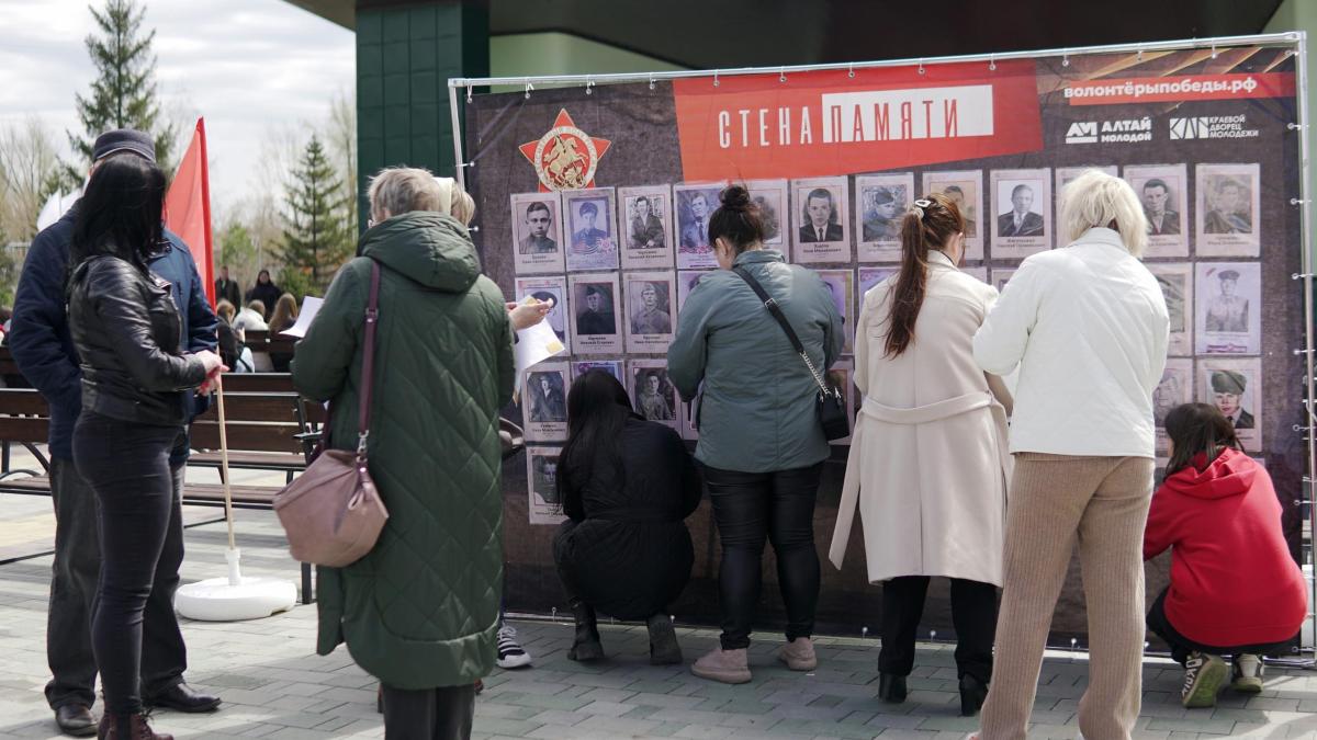 В Алтайском крае почтить память своего героя и присоединиться к акции «Бессмертного полка» горожане могут в парке культуры и отдыха «Центральный», где участники регионального отделения Движения установили «Стену памяти». На ней уже размещены портреты земляков - участников Великой Отечественной войны, останки которых были подняты при проведении поисковых работ. Портреты своих родных на «Стене памяти» разместили и участники прошедшего в парке концерта «Мы этой памяти верны», посвященного 79-летию Победы.