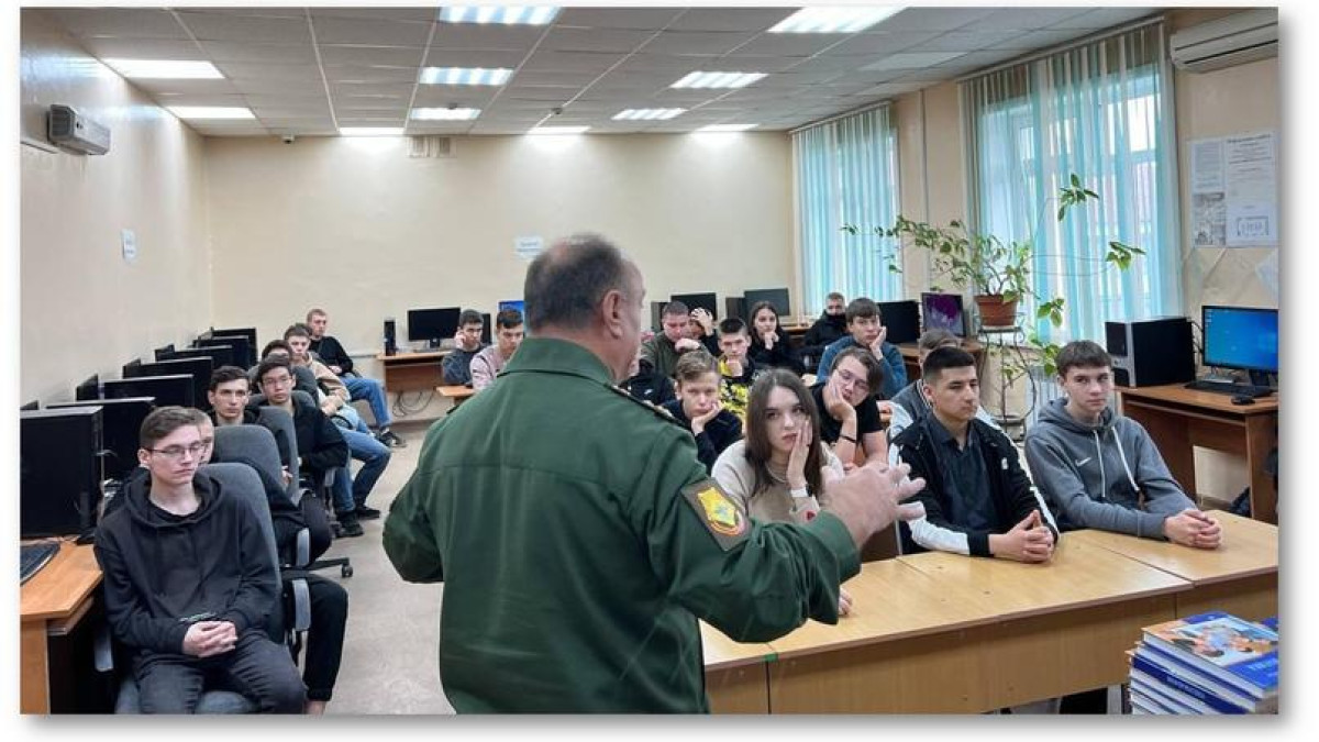«Разговоры о важном» со студентами Сахалинского техникума строительства и жилищно-коммунального хозяйства провел руководитель штаба регионального отделения Бессмертного полка России полковник запаса Андрей Фугенфиров.