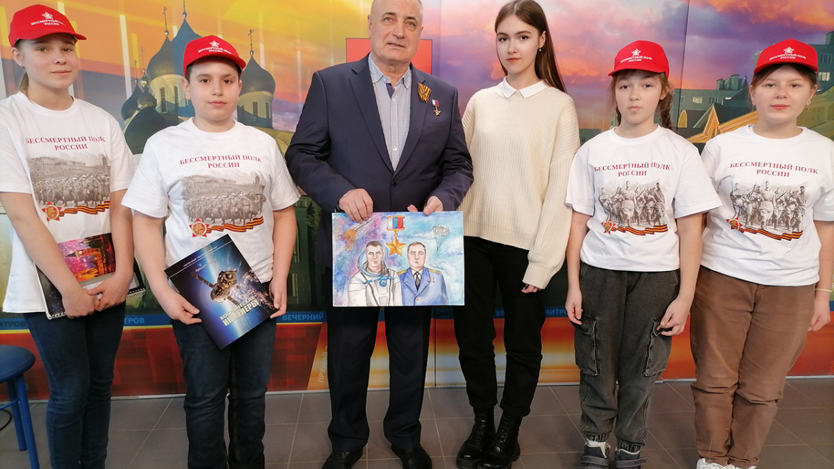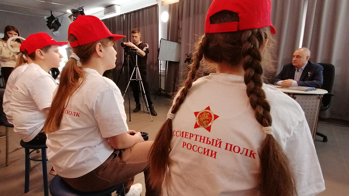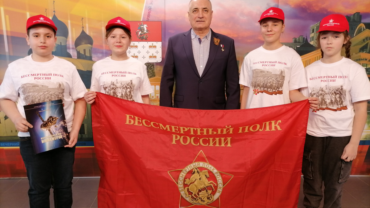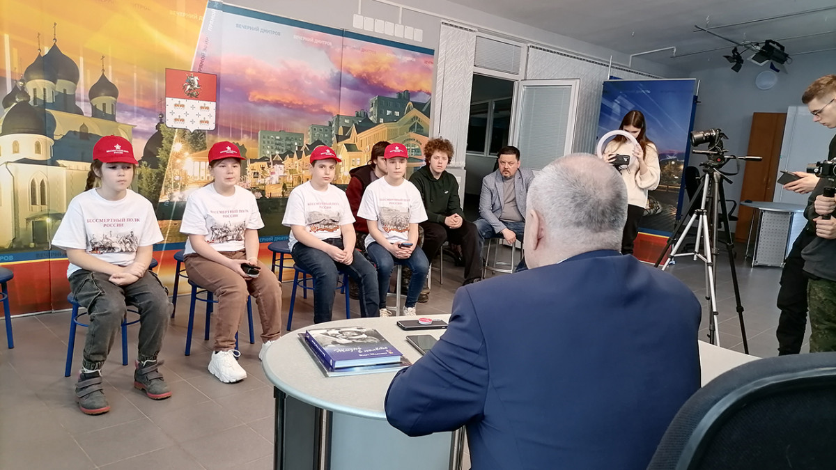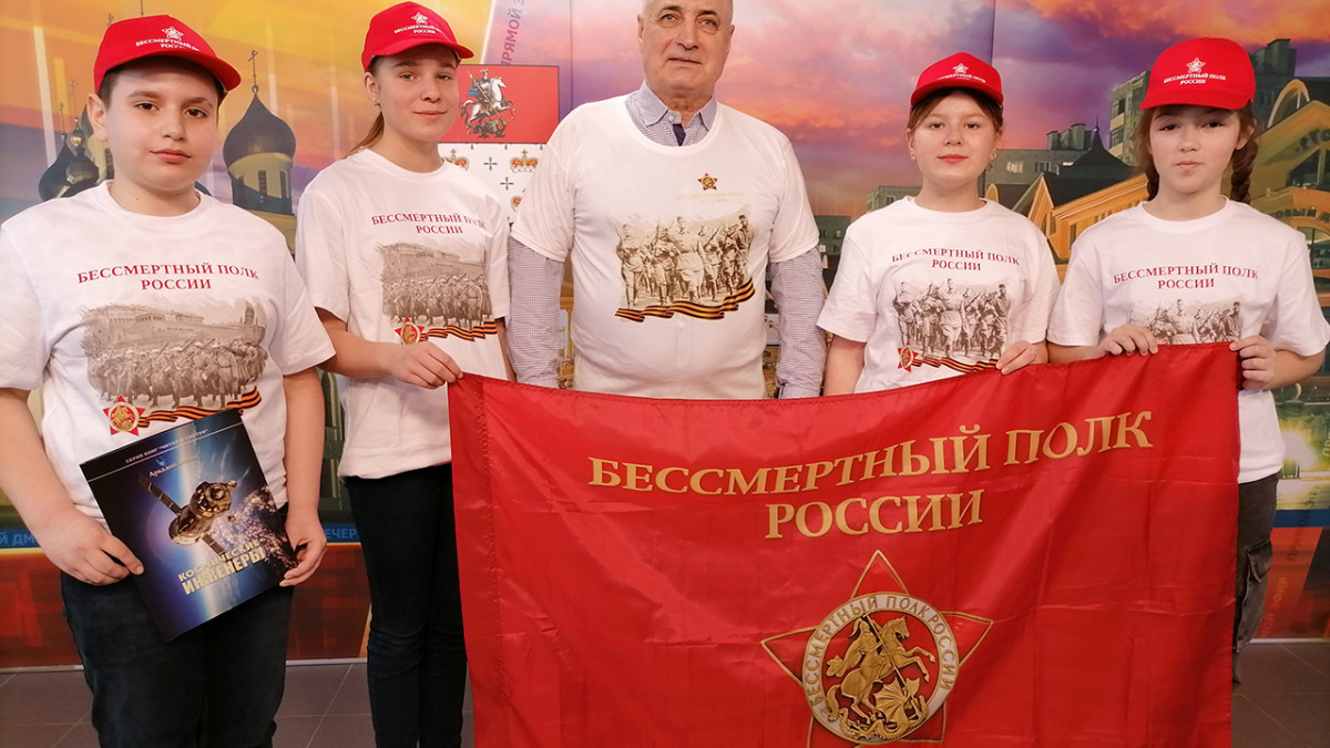 Юные добровольцы Бессмертного полка России в Московской области из Дмитровского городского округа, юнкоры студии «Звездочка», юнармейцы-курсанты отряда «Саланг» им. А. Гаскова встретились с Героем России, лётчиком, парашютистом-испытателем, полковником Игорем Евгеньевичем Тарелкиным, который рассказал о боевом пути своего отца и об участии в шествии Бессмертного полка в Берлине.