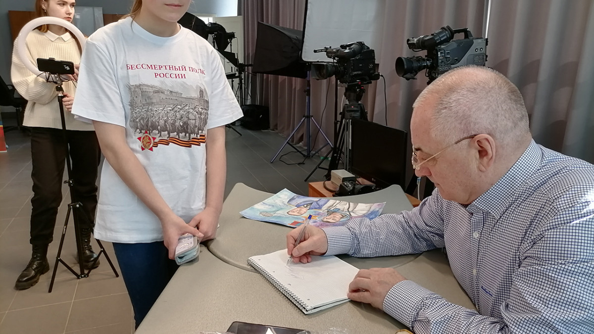 В завершении встречи юные добровольцы, которые с гордостью носят символику Бессмертного полка России, вручили гостю студии подарок - футболку с символикой Движения.