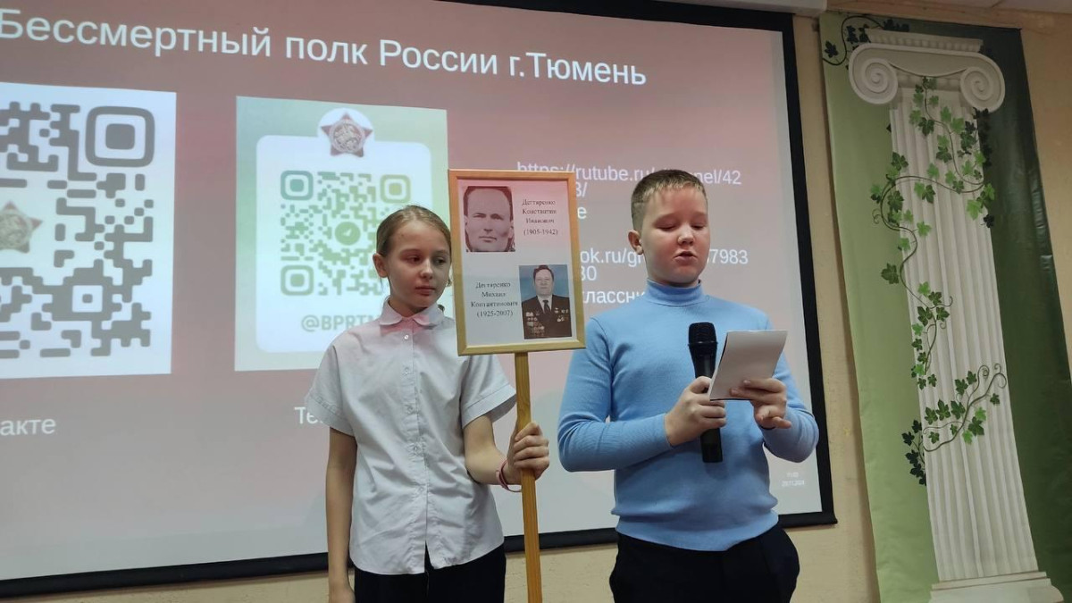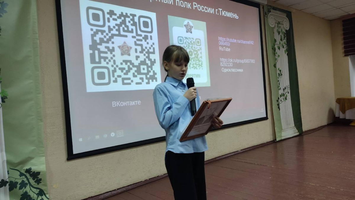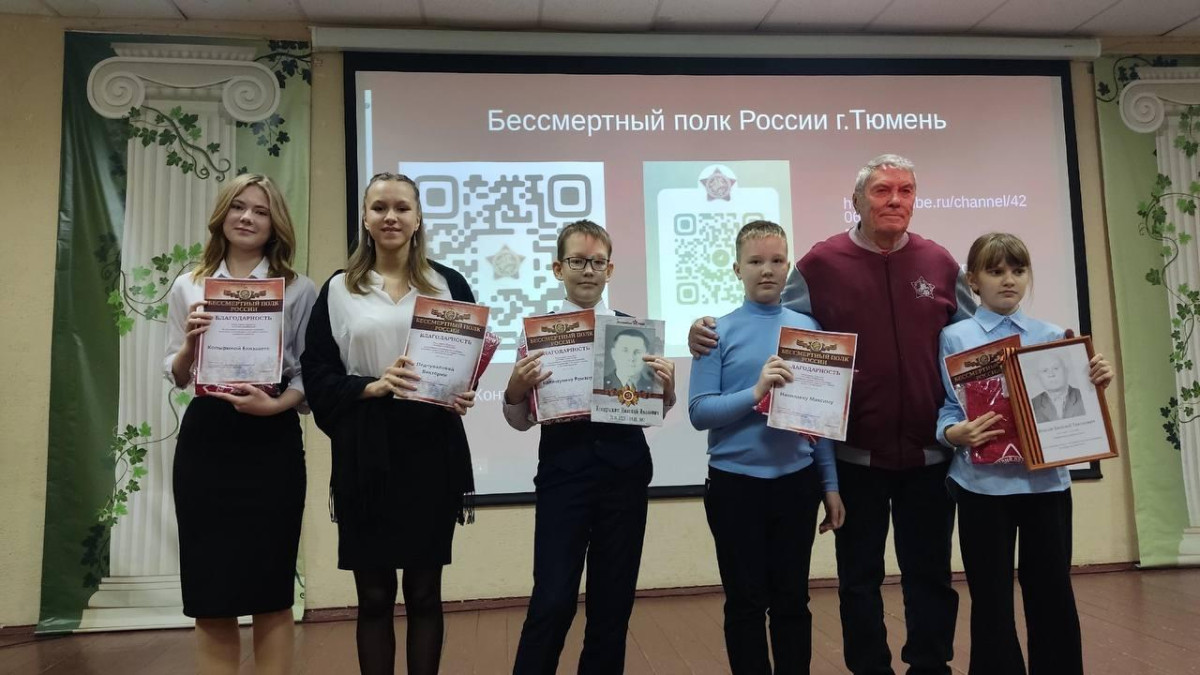 Узнав биографию своего земляка, ребята также поделились историями собственных прадедов. А ученик Максим Николаев даже принёс показать награды своего прадеда, другие школьники тоже рассказали о родных. Ребята получили дипломы участников проекта и футболки Движения, а наиболее активным участникам исторической викторины вручили яркие браслеты от Движения.Талантливые ученики исполнили песни, а также прочитали стихи о войне. Завершилась встреча в школьном музее, где есть экспозиция, посвящённая Бессмертному полку школы. Проект реализуется при поддержке Гранта Губернатора Тюменской области.