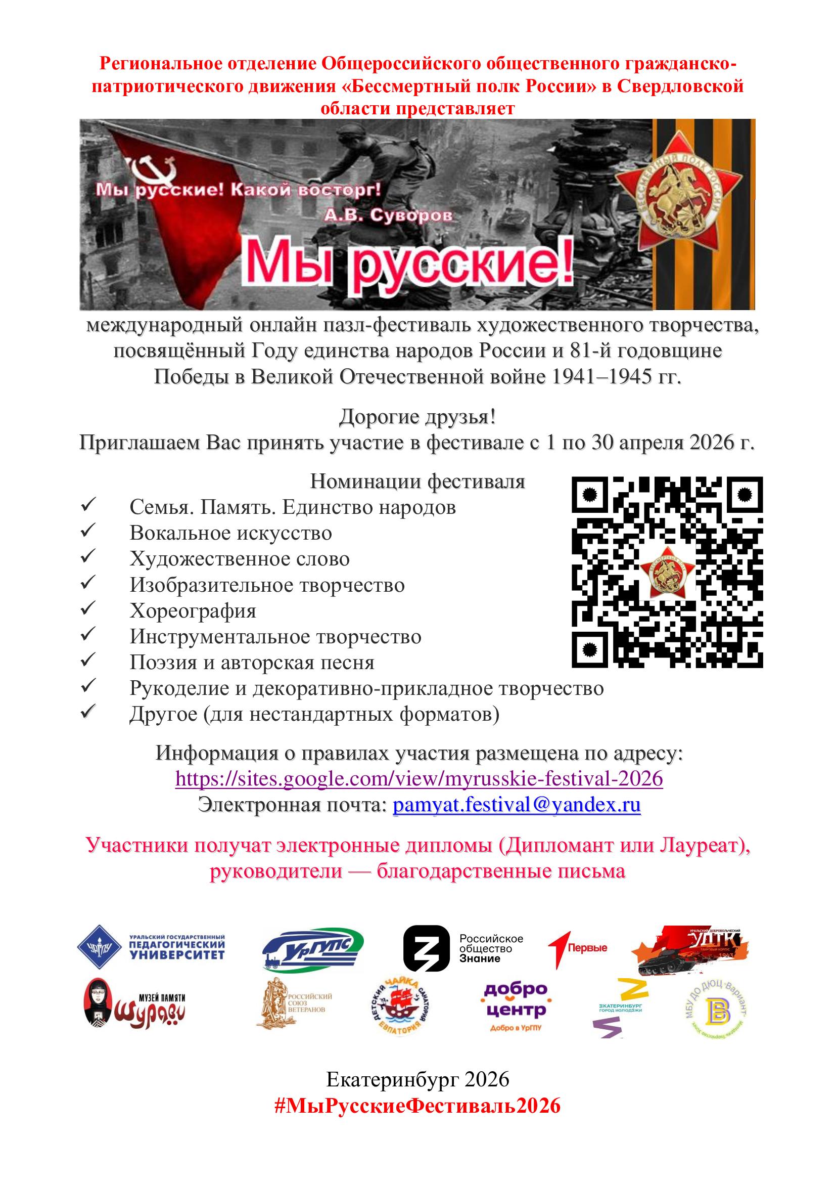 С 1 по 30 апреля 2026 года однополчане приглашают вас стать частью большого творческого события, посвящённого Году единства народов России и 81-й годовщине Победы в Великой Отечественной войне. Номинации конкурса охватывают самые разные направления: исследование боевого пути своих родственников – участников Великой Отечественной войны, вокальное искусство, изобразительное творчество, рукоделие и многое другое. Подать заявку можно на официальном сайте фестиваля https://sites.google.com/view/myrusskie-festival-2026.