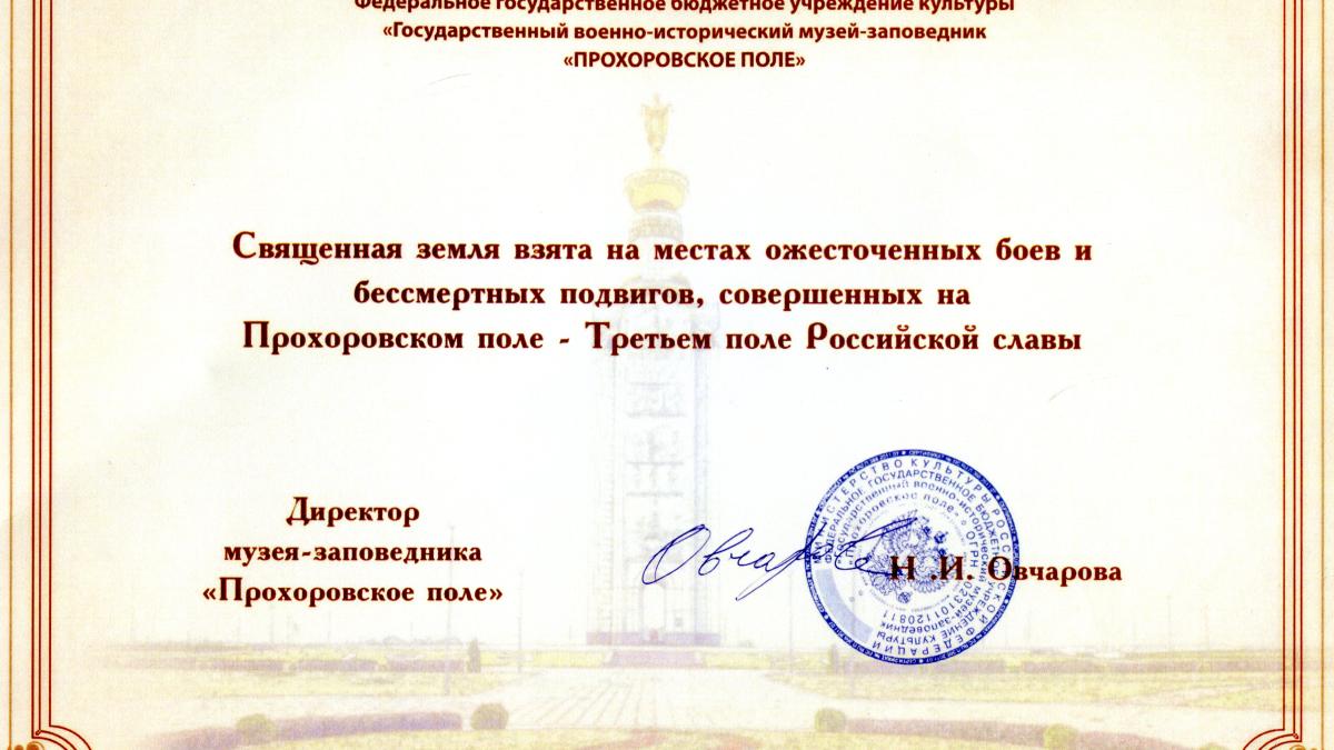 «Священной землёй поделились с нами челябинские коллеги, которые привезли её с поля битвы. Правда, предназначалась она для вручения из рук в руки самому ветерану Курской битвы. Не успели… Теперь она будет вместе с ним навечно. Остальная часть священной земли вместе с сертификатом передана на хранение в местный музей», – сказал Геннадий Кириллович.