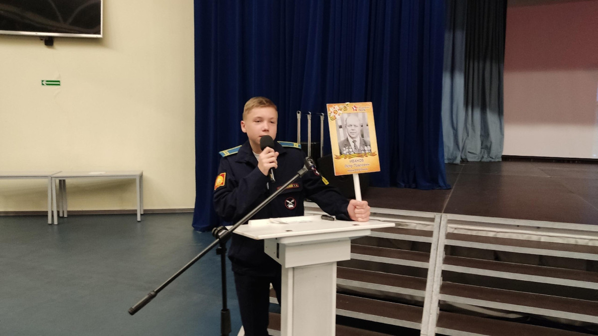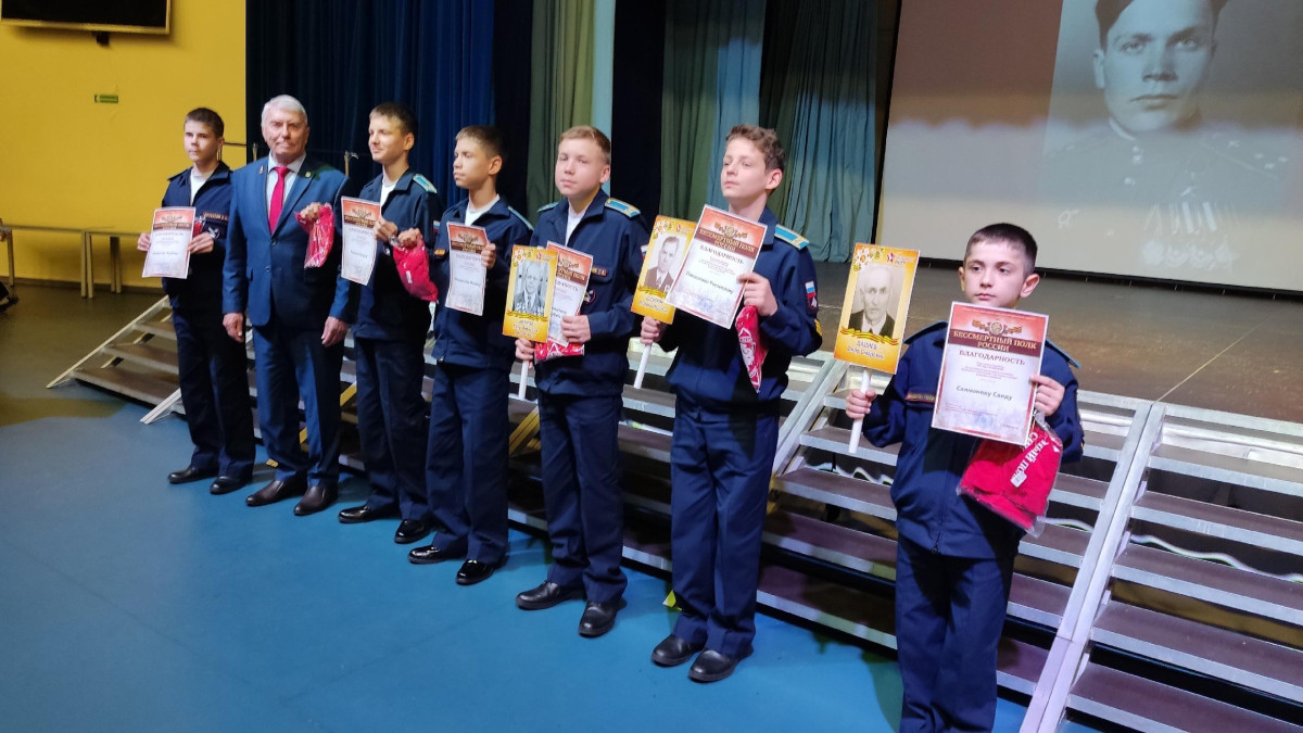 Кадеты 7-е класса Тимофей Поддельский, Ростислав Панасенко и Саид Салманов рассказали о подвигах своих прадедов. Все выступавшие ребята получили Благодарности от регионального отделения Бессмертного полка России в Тюменской области за активную жизненную позицию, бережное отношение к истории страны и памяти предков.