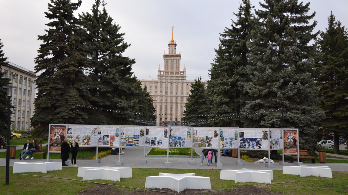 В честь Дня Победы в Сквере студенческих отрядов в Челябинске открылась вторая выставочная экспозиция «Боги войны из Челябинской области. Они спасли мир».