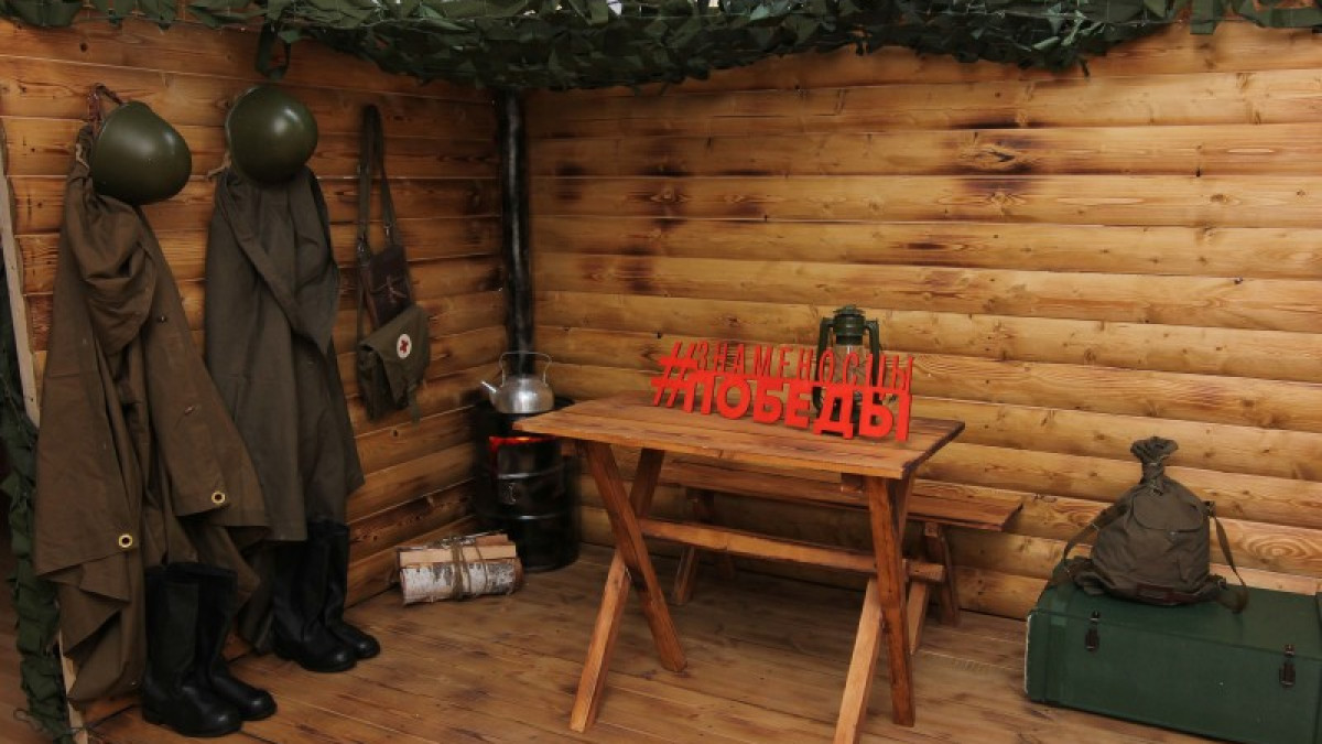 На площадке проекта также смонтирован фрагмент блиндажа с сопутствующим реквизитом – это плащ-палатки, каски, автоматы, грубые кирзовые сапоги, сумки, вещмешок, фляги и другая атрибутика военного времени. Все предметы экспозиции воссозданы в соответствии с их историческими оригиналами. Их можно трогать, примерять, фотографироваться.