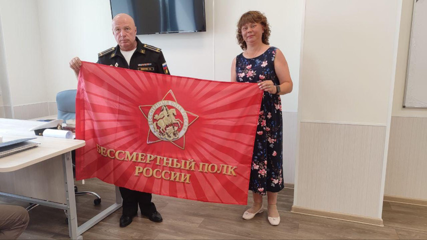 Руководитель штаба регионального отделения Бессмертного полка России в Иркутской области Светлана Минеева, передала нахимовцам флаг Бессмертного полка России и книги серии «Непридуманные истории».
