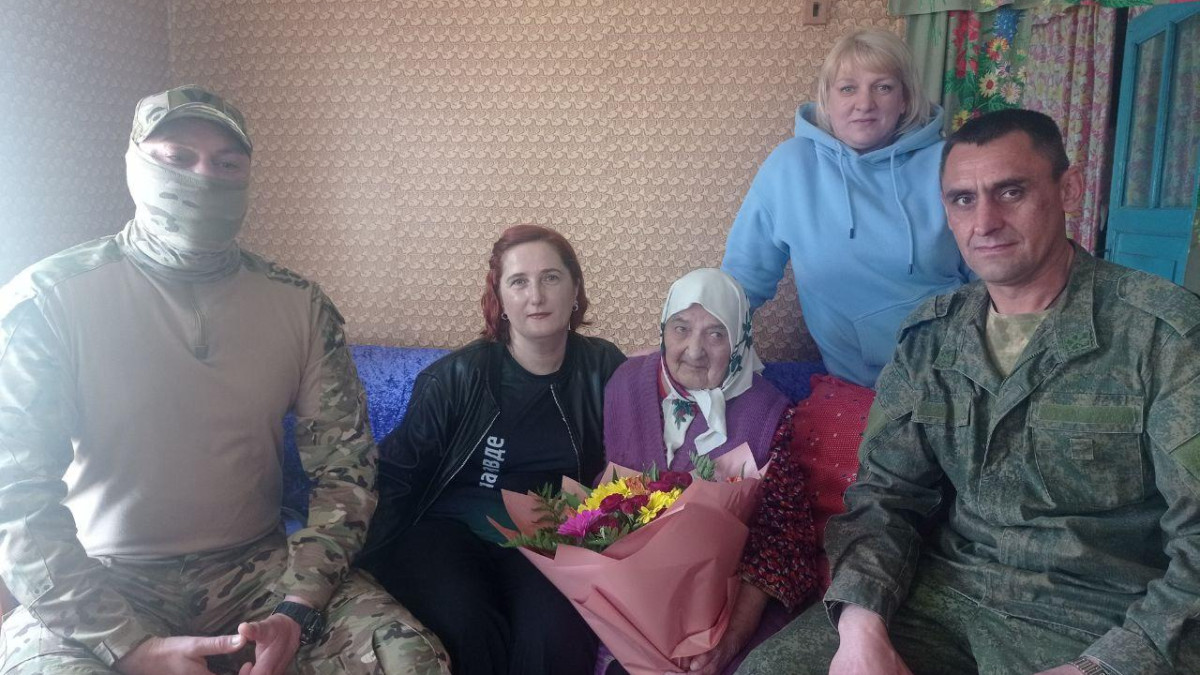 Военнослужащие СВО, приехавшие домой в отпуск, выступили с инициативой поздравить ветерана как со столетием, так и с грядущим праздником – Днем Победы.
