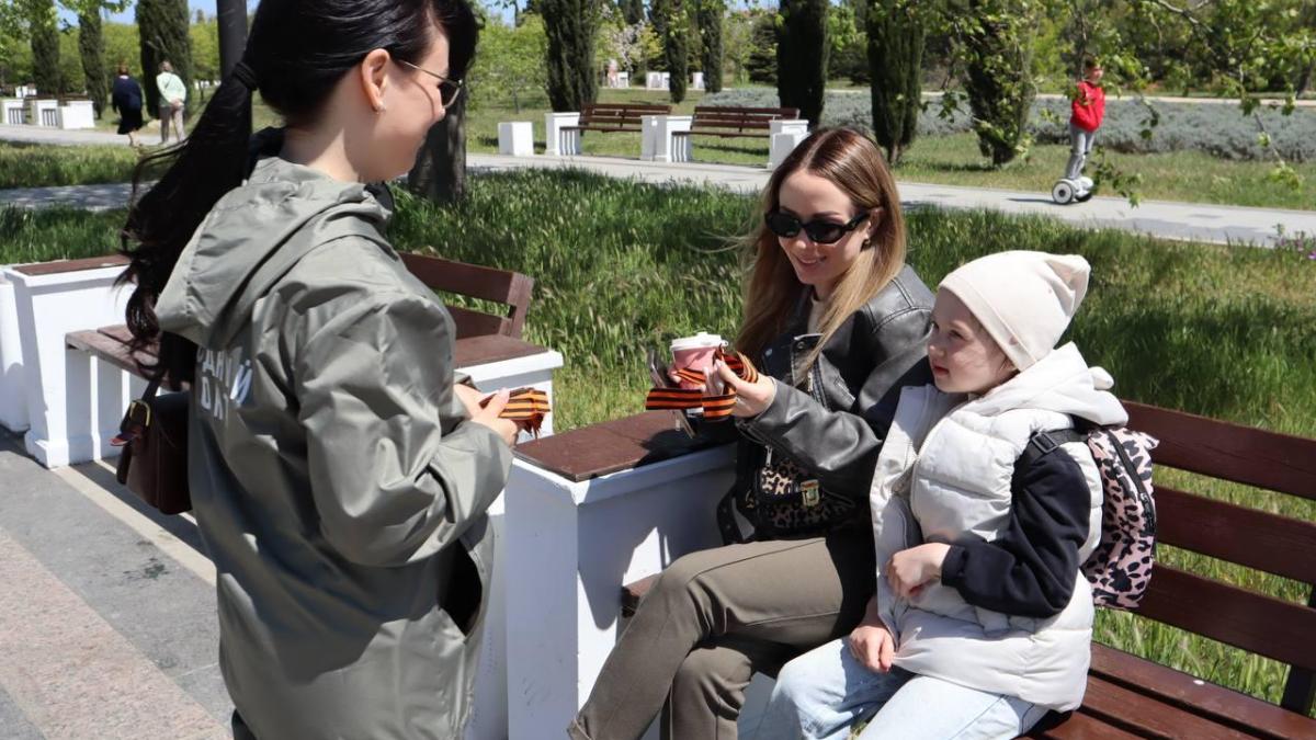 В Севастополе однополчане вместе с другими активистами раздавали горожанам и гостям города георгиевские ленты, помогали правильно прикрепить лену, а также рассказывали о том, как появился символ мужества и героизма.