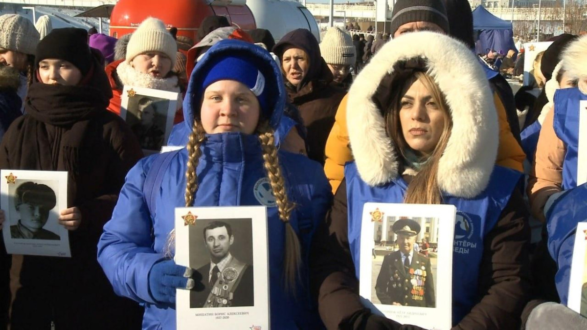 В Тюмени День защитника Отечества отметили шествием, Бессмертный полк впервые провели на #СпецоперацииЛед. Горожане прошли по льду Туры с портретами 130 тюменцев-героев Великой Отечественной войны. Во главе колонны на портретах были портреты 32 ныне здравствующих ветерана.