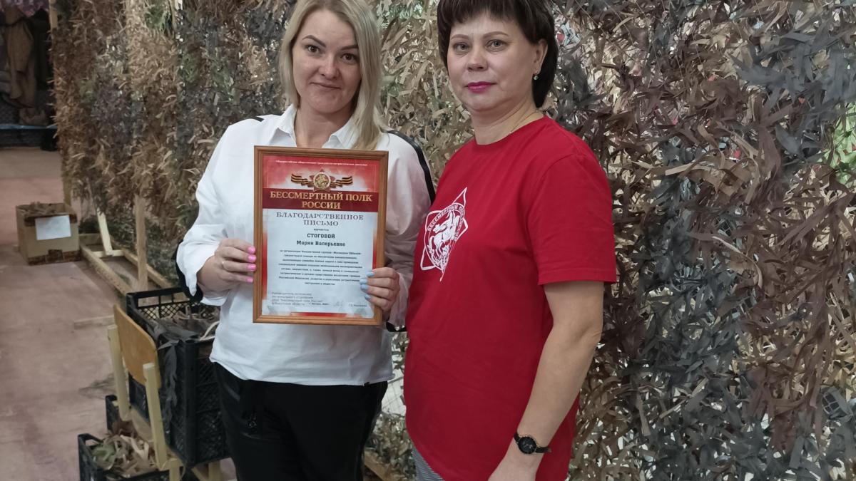 За большой вклад в организацию добровольческой деятельности по изготовлению маскировочных сетей для участников СВО руководитель инициативной группы Мария Логинова была отмечена благодарностью регионального отделения Бессмертного полка России.